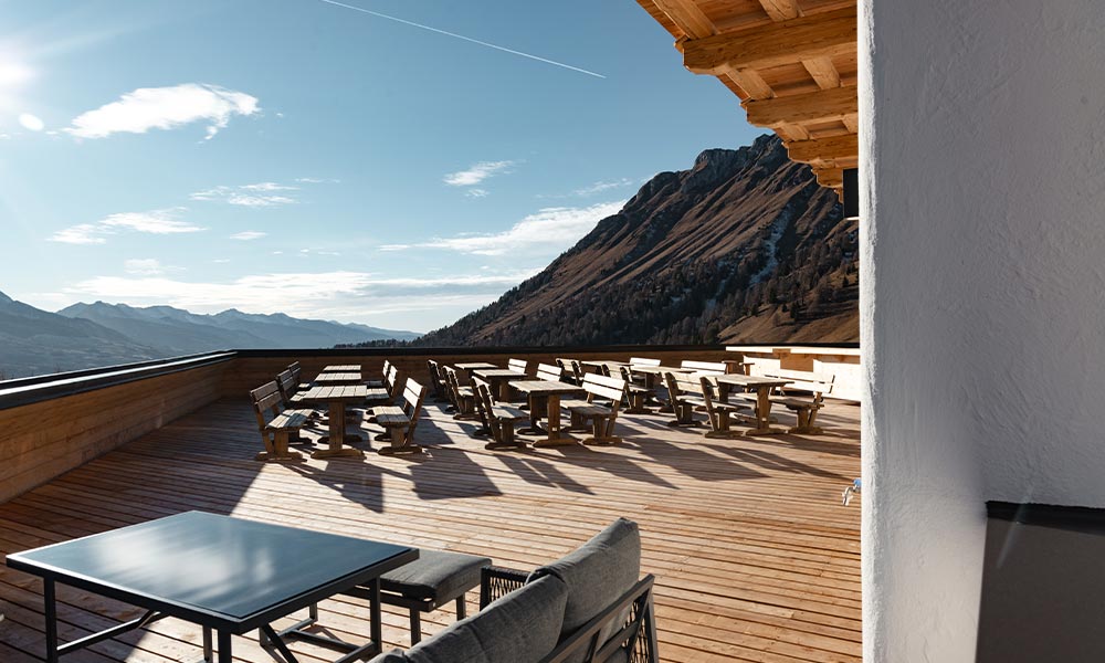 Sulla nostra terrazza panoramica potrete dimenticare i pensieri, staccare la spina per un attimo e godervi la natura. Con una vista a 360*, nel mezzo delle Alpi, possiamo regalarvi una vista indimenticabile e mozzafiato del territorio circostante e lasciarvi incantare dal punto di vista gastronomico.
